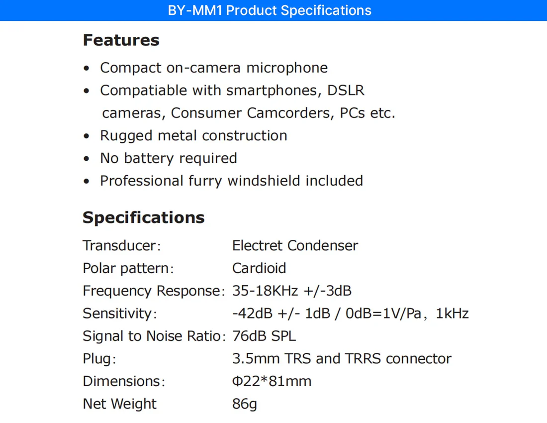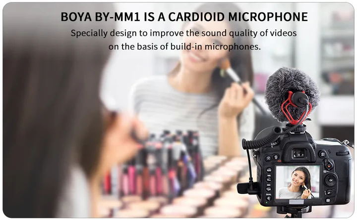 The BOYA BY-MM1 is a cardioid microphone, which specially design to improve the sound quality of videos on the basis of build-in microphones.