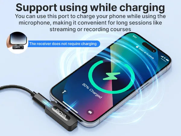 All-Day Power: The ultralight transmitter boasts an impressive 9-hour battery life on a single charge. Plus, the receiver's pass-through USB-C charging port lets you charge your phone while recording. Never cut a stream short again!