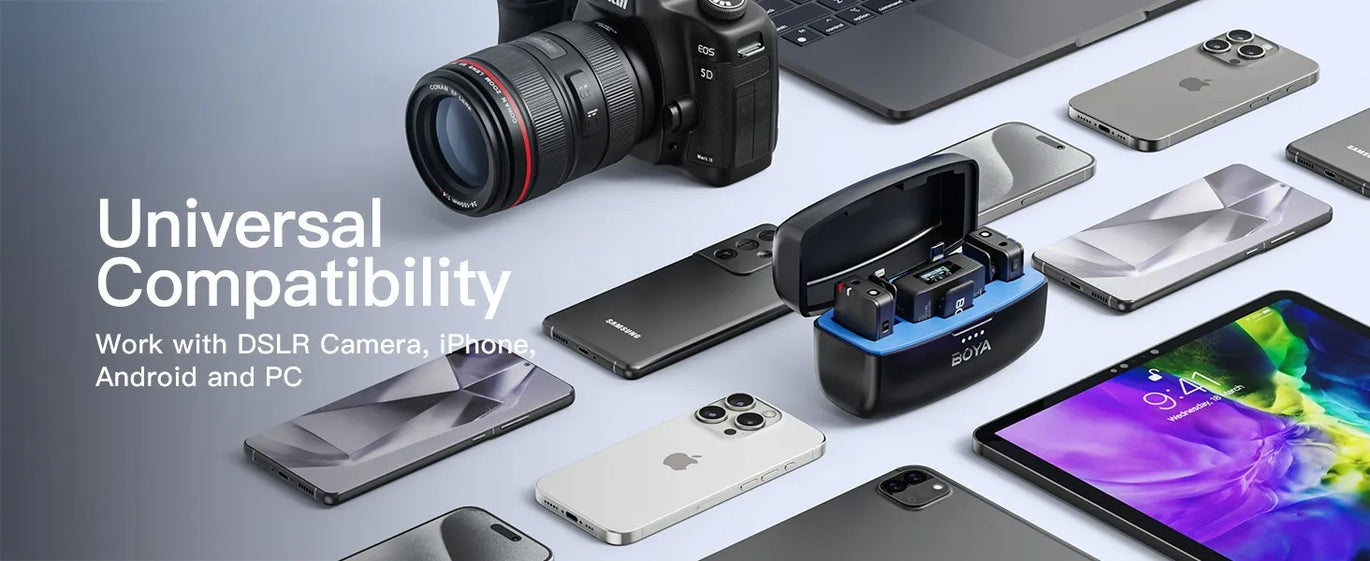 Never miss a word. Never lose a recording. The BOYAMIC is the ultimate "all-terrain" wireless microphone system designed for creators who demand fail-proof audio. Whether you are filming a high-stakes interview on a DSLR, a quick viral clip on an iPhone, or a podcast on your laptop, the BOYAMIC adapts instantly.