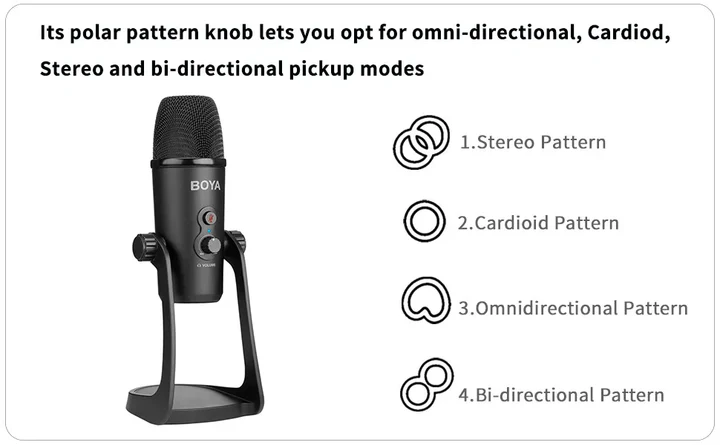 - Stereo, cardioid, omnidirectional, and bi-directional polar patterns